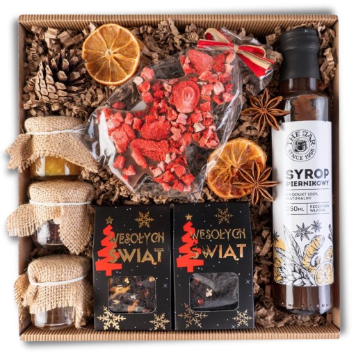 KOSZ PREZENTOWY ŚWIĄTECZNY ZESTAW HERBAT CZEKOLADA SYROP PIERNIKOWY ŚWIĘTA
