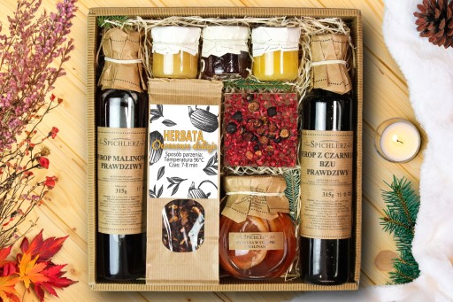 KOSZ PREZENTOWY PREZENT NA ŚWIĘTA ZESTAW HERBATA KAWA PREMIUM BOX SYROP