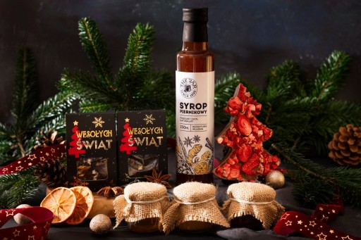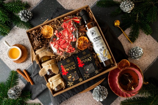 W sercu tego urokliwego zestawu kryje się delikatna czekolada w kształcie choinki z manufaktury, mieszanka wyjątkowych herbat świątecznych oraz słodkie akcenty w postaci syropu piernikowego i konfitur. Wszystko to starannie zapakowane w ręcznie pleciony, malowany na elegancki brązowy kolor koszyk Green Touch, dopełniony suszonymi plastrami pomarańczy i anyżem. Idealny jako prezent na Mikołajki, dostarczy obdarowanym nie tylko smakowitych produktów, ale także ciepłych uczuć związanych z najpiękniejszym okresem w roku. Czy jest lepszy sposób, by powiedzieć „Wesołych Świąt”?