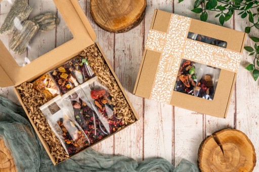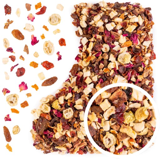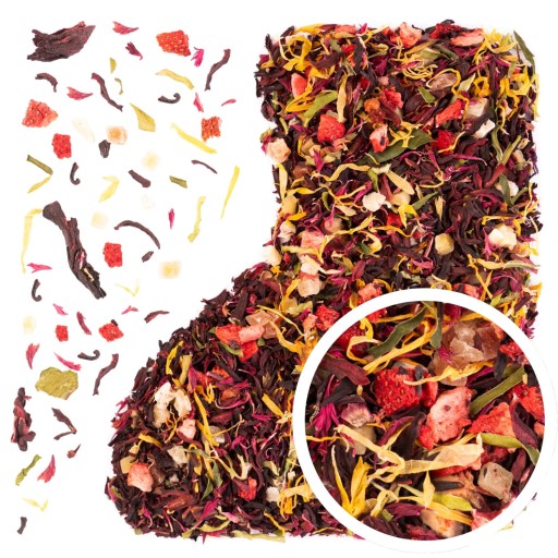 W środku znajdziesz 6 wyjątkowych herbat owocowych sypanych, każda po 50 g, zapakowanych w transparentne opakowania, które podkreślają ich naturalne składniki i intensywne kolory. Herbaty nie zawierają czarnej ani zielonej herbaty – to w 100% owocowe kompozycje, stworzone z myślą o relaksie, zdrowiu i przyjemności picia. Aromatyczne mieszanki, starannie dobrane suszone owoce i kwiaty, a także ozdobne opakowanie sprawiają, że to gotowy zestaw prezentowy – bez potrzeby dodatkowego pakowania.