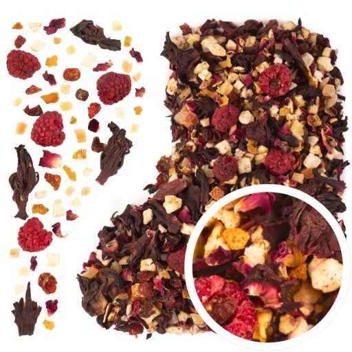 - Kolorowa Rozkosz (50 g) – hibiskus, mango, papaja, ananas, jabłko, płatki róży, malina