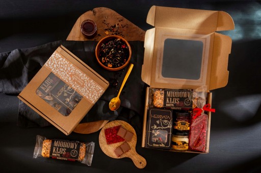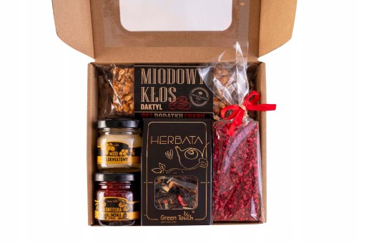 Zestaw prezentowy herbata miód konfitura malinowa czekolada baton miodowy